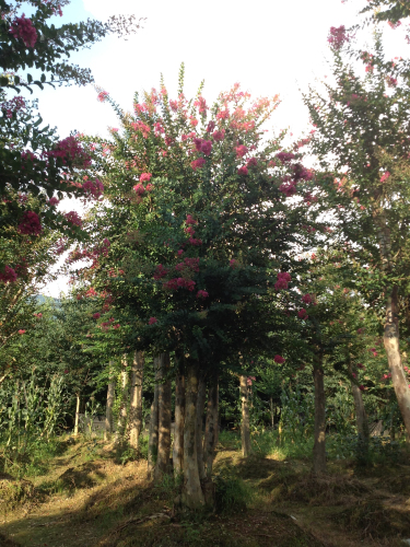 紫薇树干光洁树姿优美花色艳丽而花期特,夏秋相连长可逾百日故有百日红之称在园林绿化中是城市街道、住宅区、公园广场、景点休闲带、现代别墅庭院中常见的树种。